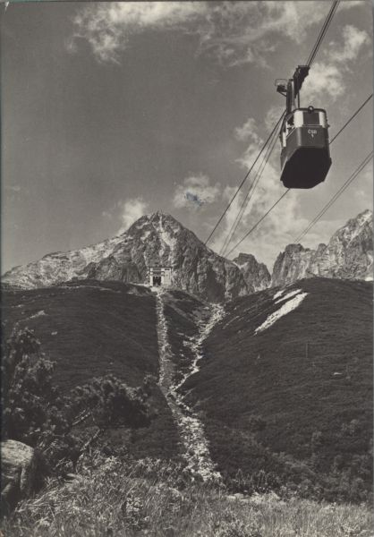 Wagonik kolei linowej na Łomnicê w drodze nad Łomnicki Staw. Widoczny budynek stacji po¶redniej. W tle Łomnica, Widły i Kieżmarski Szczyt. Pod kolej± płaty kosodrzewiny (Pinus mugo Turra).