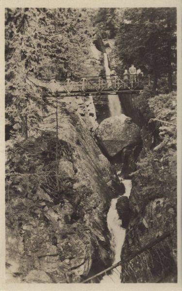 Widok na Wodospad Olbrzymi w Dolinie Małej Zimnej Wody. Na mostku, stanowiącym część Magistrali Tatrzańskiej grupka turystów.