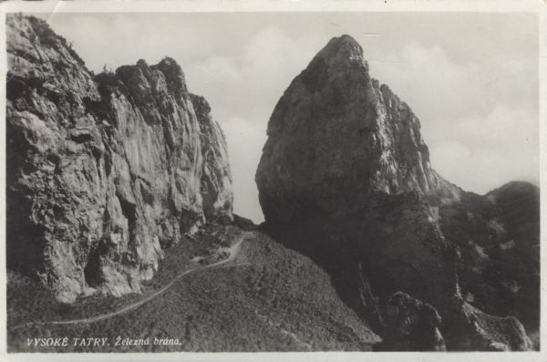 Widok na Skalne Wrota w Tatrach Bielskich. Na dole fotografii po lewej stronie podano tytuł pocztówki.