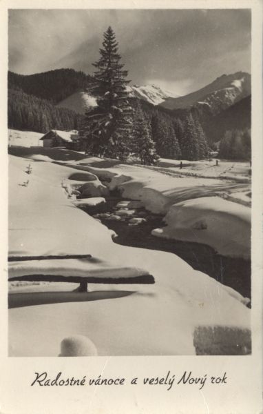 Zimowy pejzaż z Jaworzyny. Pod zdjęciem tekst życzeń: Radostné vánoce a veselý Nový rok.