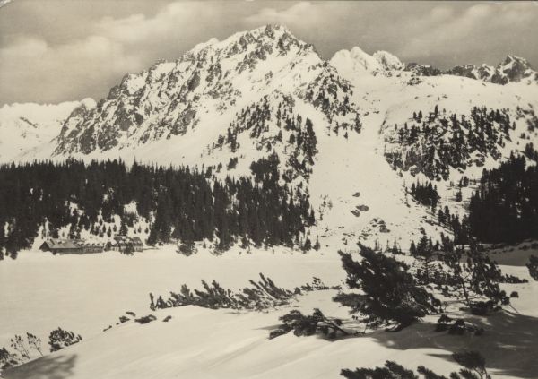 Na pierwszym planie zamarznięty Popradzki Staw. W głębi schronisko nad Popradzkim Stawem. W tle widać Wołowy Grzbiet, Wysoką, Ganek, Rumanowy Szczyt i Żłobisty Szczyt.