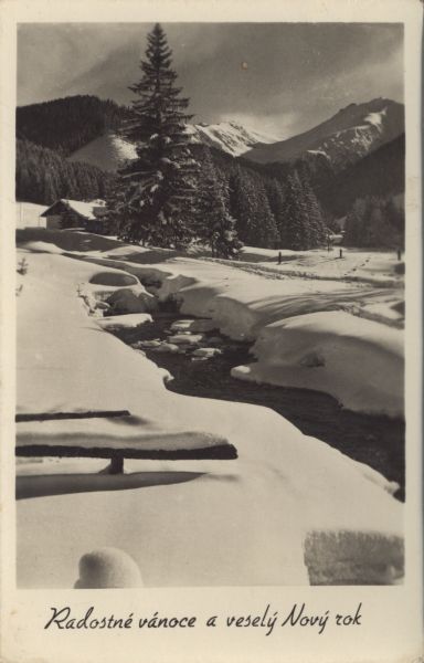 Zimowy pejzaż z Jaworzyny. Pod zdjęciem tekst życzeń: Radostné vánoce a veselý Nový rok.
