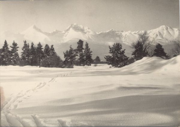 Zimowy widok na Tatry Wysokie od południa: Tępa, Kończysta, Batyżowiecki Szczyt, Gerlach, Starole¶ny Szczyt i Sławkowski Szczyt.