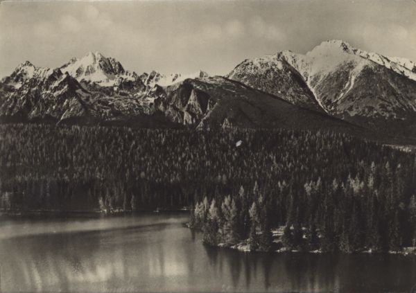 Widok na Szczyrbskie Jezioro i otaczające go lasy. W tle pokryte śniegiem wierzchołki szczytów - od lewej: Kopa Popradzka, Wysoka, Tępa i Kończysta. Z przodu Osterwa.