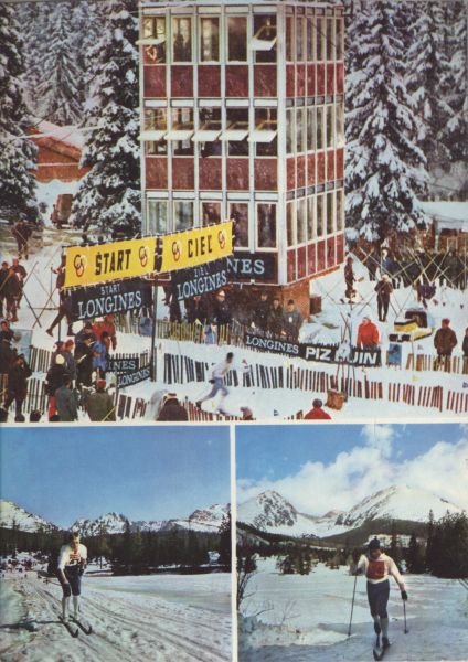 Pocztówka 3. elementowa, zimowe zawody w biegach narciarskich: Wieża sędziowska, przed nią start i meta biegu oraz widzowie
