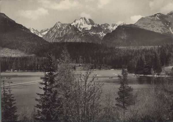 Widok na Wysok± znad Szczyrbskiego Jeziora. Na jeziorze widoczne łodzie.