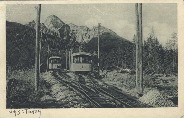 Wagony kolei linowo-terenowej ze Starego Smokowca na Siodełko. W tle Łomnica.