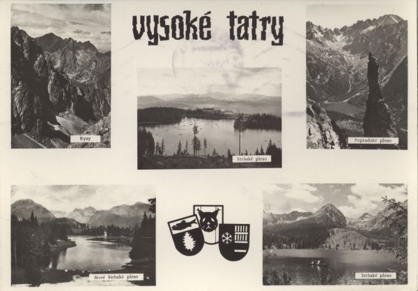 Widok na Szczyrbskie Jezioro, w tle Szczyrbskie Solisko. W górnej części pocztówki napis: vysoké tatry, a w dolnej herby 3 miejscowości.