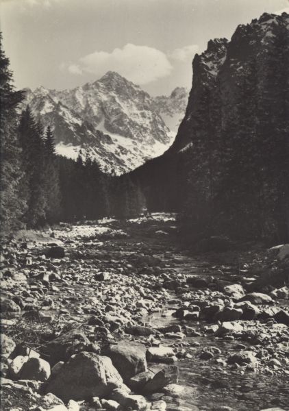 Widok z Doliny Białej Wody. Na pierwszym planie potok Biała Woda. W tle zaśnieżony Ganek, z prawej Młynarz.
