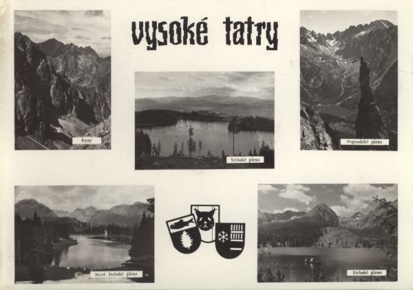 Widok na Szczyrbskie Jezioro, w tle Szczyrbskie Solisko. W górnej części pocztówki napis: vysoké tatry, a w dolnej herby 3 miejscowości.