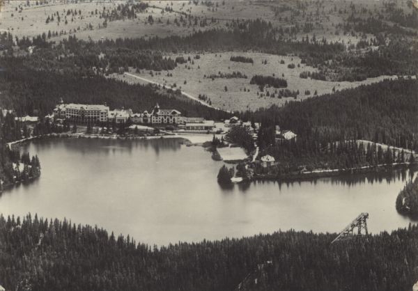Szczyrbskie Jezioro. Widok na jezioro i zabudowania na brzegu. Na dole po prawej stronie skocznia narciarska.