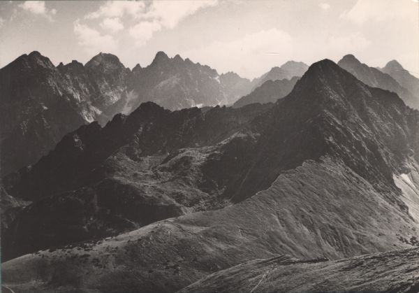 Tatrzański Park Narodowy [Słowacja]. Widok na grupę Łomnicy z Tatr Bielskich. Z lewej: Kieżmarski Szczyt i Łomnica, Baranie Rogi. Z przodu: Jagnięcy Szczyt, z lewej: Kozi Szczyt i Lodowy Szczyt.