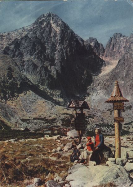 Widok na Dolinę Łomnick±. W tle Łomnica, Zachodni Szczyt Wideł, Przełęcz w Widłach i Wielki Szczyt Wideł. Na pierwszym planie widoczne 2 turystki, za nimi kierunkowskazy turystyczne.