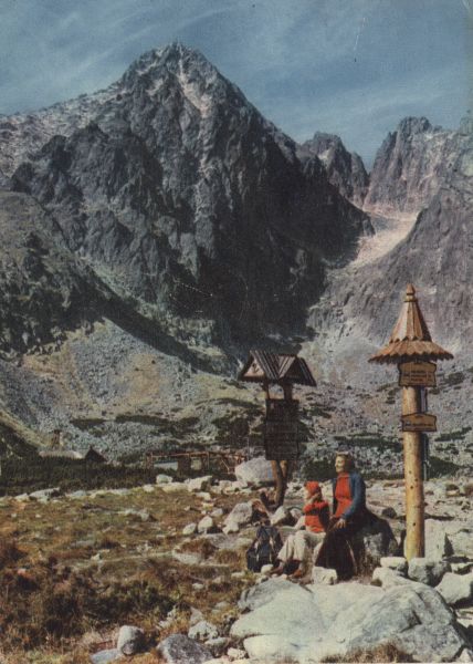 Tatrzański Park Narodowy [Słowacja]. Łomnica nad Dolin± Łomnick±. Z prawej Zachodni Szczyt Wideł, Przełęcz w Widłach i Wielki Szczyt Wideł. Tytuł również w języku: ros., ang., niem.