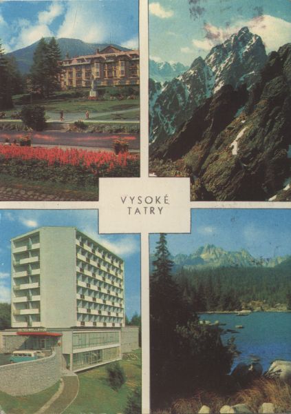 Widok od Szczyrbskiego Jeziora na Wysok±. Pomiêdzy zdjêciami napis: VYSOKÉ TATRY.