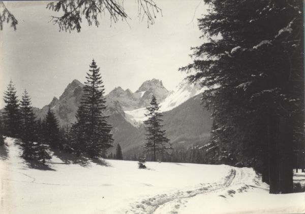 Polana Biała Woda w Dolinie Białej Wody zim±, na ¶niegu widoczny wydeptany szlak. W tle widok na południe na Dolinę Żabich Stawów Białczańskich. Od lewej Młynarz, Wysoka, Niżnie Rysy i Niżni Żabi Szczyt.