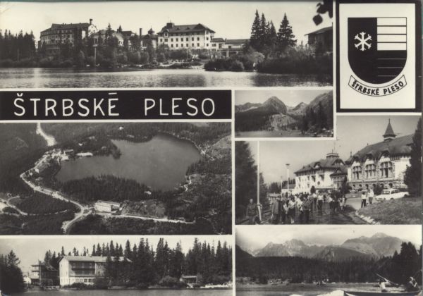 Budynki starego dworca kolejowego: Widok na grupę Wysokiej i Kończyst± znad Szczyrbskiego Jeziora. W górnym prawym rogu herb Szczyrbskiego Jeziora. Pomiędzy zdjęciami napis: ©TRBSKÉ PLESO.