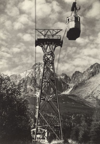 VYSOKÉ TATRY - lanovka na Skalnaté pleso (1761 m), dole medzistanica Štart (1145 m), v pozadí Lomnický štít (2632 m)