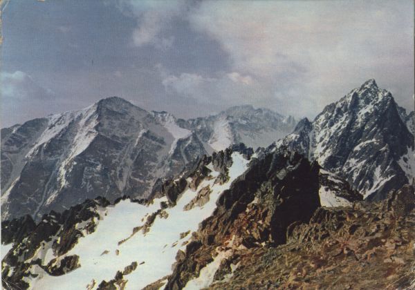 TATRANSKÝ NÁRODNÝ PARK - Pohľad z Lomnického sedla (2193 m) na juhozápad. Vľavo Slavkovský štít (2453 m), uprostred Gerlachovský štít (2655 m), vpravo Prostredný hrot (2440 m)