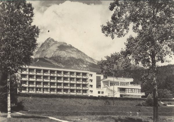 Budynek związkowego domu wypoczynkowego Morawa w Tatrzańskiej Łomnicy i jego otoczenie. W tle Kieżmarski Szczyt. Na pierwszym planie drzewa liściaste.