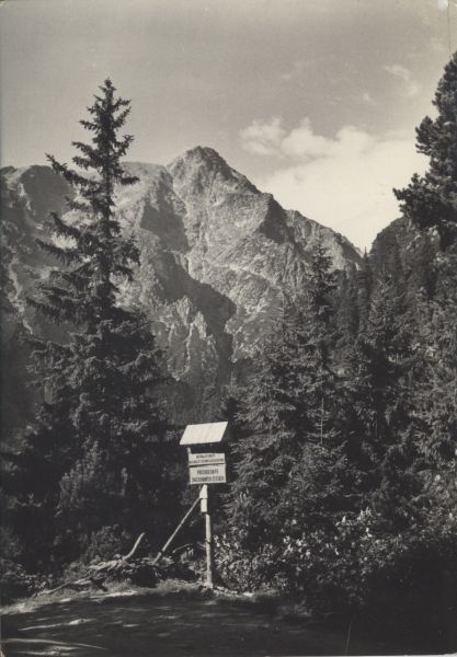 Widok na Sławkowski Szczyt z Magistrali Tatrzańskiej. Na pierwszym planie kierunkowskaz turystyczny, za nim las.
