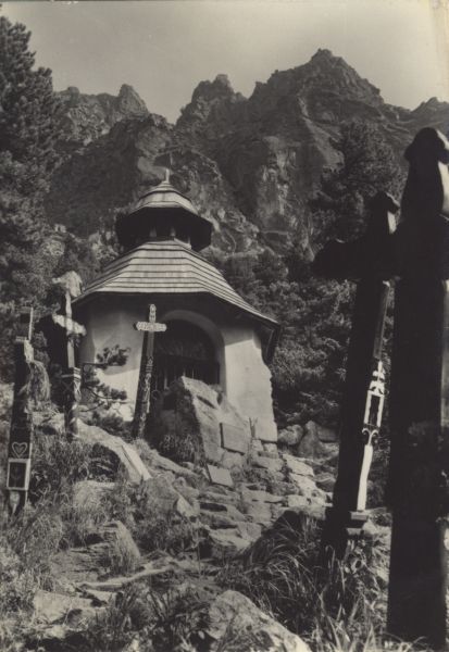 Tatry Wysokie - Dolina Mięguszowiecka. Symboliczny cmentarz, kapliczka z drewnianymi krzyżami rzeźbionymi we wsi Detva. Tytuł również w języku: ros., niem.