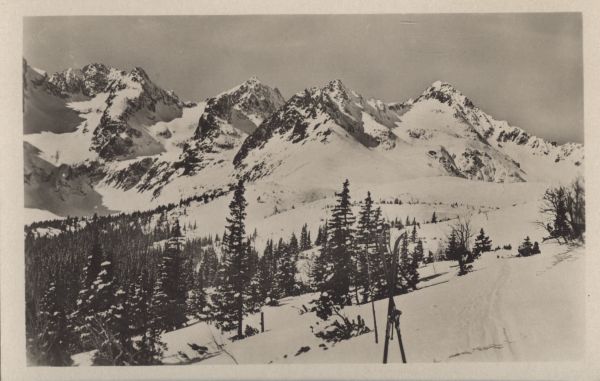 Otoczenie Zielonego Stawu Kieżmarskiego w zimowej scenerii. W tle Kołowy Szczyt, Jagnięcy Szczyt. Na pierwszym planie narty.