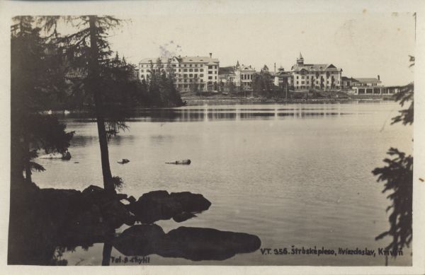 Szczyrbskie Jezioro. Hotele Hviezdoslav i Krywań. Na dole wpisany tytuł i nazwisko fotografa.