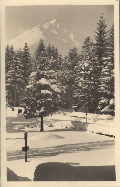 Park w Tatrzańskiej Łomnicy w zimowej scenerii. W tle Sławkowski Szczyt.