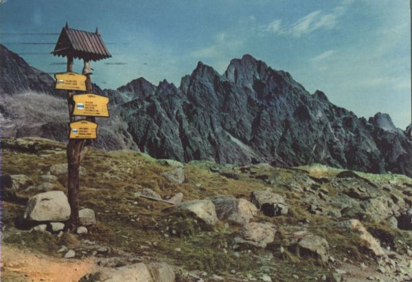 Widok z Doliny Staroleśnej na Pośrednią Grań i Żółty Szczyt. Na pierwszym planie szlak i kierunkowskaz turystyczny.
