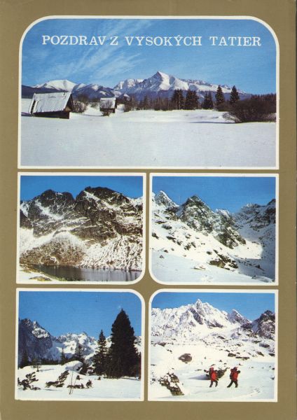 Napis: POZDRAV Z VYSOKÝCH TATIER. Pocztówka 5. elementowa, zimowa. Na zdjęciu u góry widok na Krywań ze wsi Przybyliny, na pierwszym planie ośnieżone szałasy. Poniżej po lewej stronie Wielki Staw Hińczowy. Obok Kozia Strażnica. Poniżej turyści w Rumanowej Dolinie w tle widać Żłobisty Szczyt. Obok Dolina Zielonego Stawu.