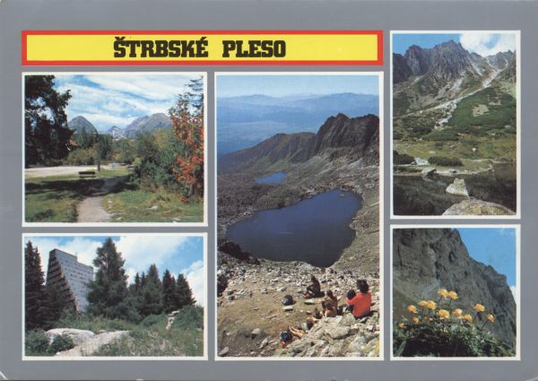 Pocztówka 5. elementowa. Na zdjęciu u góry po lewej stronie miejscowość Szczyrbskie Jezioro, w tle widać Wielkie Solisko, Szczyrbski Szczyt i Grań Baszt. Poniżej Hotel Panorama. Obok turyści w Dolinie Furkotnej, widać Furkotne Stawy. Obok u góry dolina Młynicka. Poniżej Pełnik europejski. Napis: ŠTRBSKÉ PLESO.