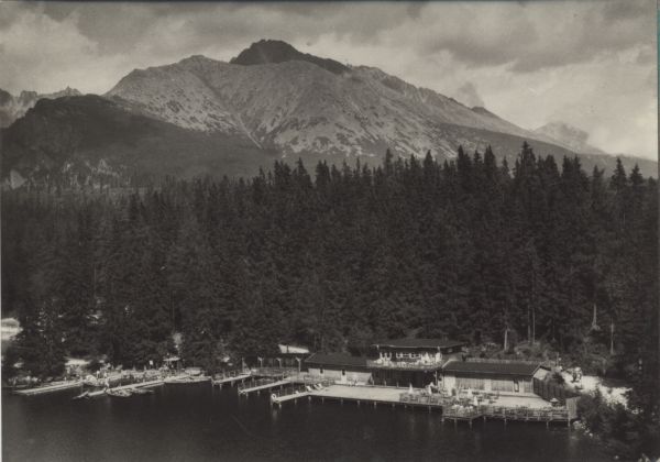 VYSOKÉ TATRY Štrbské pleso (1350 m) Kúpalisko, v pozadí Tupá (2284 m) a Končistá (2534 m)
