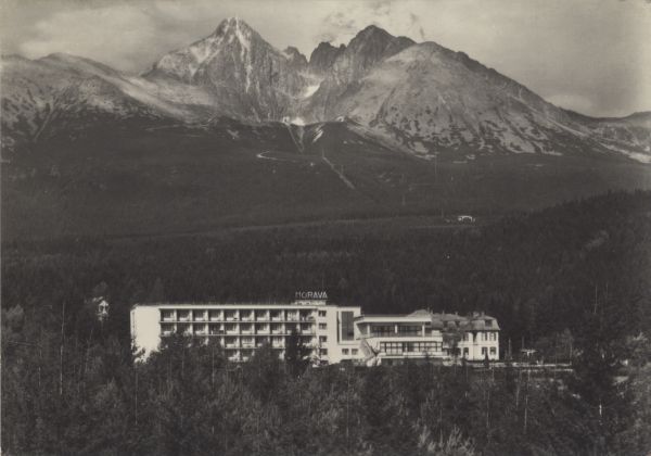 VYSOKÉ TATRY - Tatranská Lomnica Zotavovňa ROH Morava. V pozadí Lomnický ątít (2634 m). Vidlové veľe a Keľmarský ątít (2556 m)