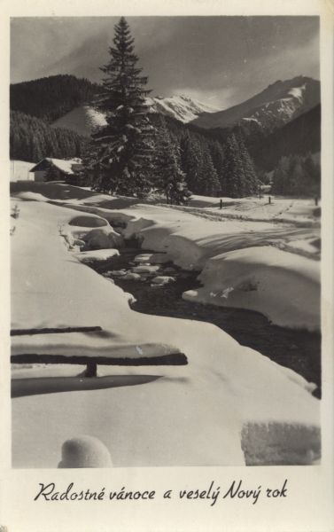 Zimowy pejzaż z Jaworzyny Spiskiej. Na pierwszym planie potok, w tle szałas, las i szczyty. Pod zdjęciem życzenia: Radostné vánoce a veselý Nový rok.