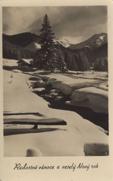 Zimowy pejzaż z Jaworzyny Spiskiej. Na pierwszym planie potok, w tle szałas, las i szczyty. Pod zdjęciem życzenia: Radostné vánoce a veselý Nový rok.