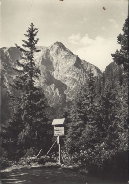 Widok na Sławkowski Szczyt z Magistrali Tatrzańskiej. Na pierwszym planie kierunkowskaz turystyczny, za nim las.