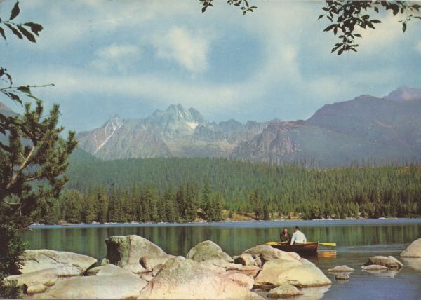 Na pierwszym planie łódka z turystami na Szczyrbskim Jeziorze. W tle widać Popradzką Kopę, Wysoką i stoki Tępej.