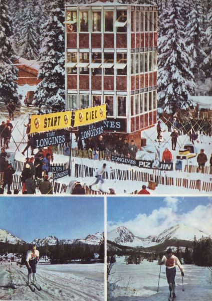 Pocztówka 3. elementowa. Przedstawia zimowe zawody w biegach narciarskich. U góry budynek sędziowski, przed którym znajduje się start i meta biegu. U dołu na obu zdjęciach zawodnicy na nartach biegowych.