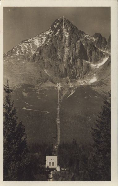Kolej linowa na Łomnicę. W dole stacja początkowa w Tatrzańskiej Łomnicy, powyżej stacja pośrednia nad Łomnickim Stawem. W tle szczyt Łomnicy.