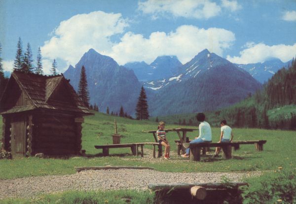 Obudowane źródło przy szlaku na Polanie Biała Woda. W tle Młynarz, Rysy i Żabi Szczyt Niżni. Na pierwszym planie turyści.