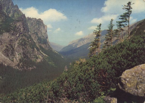 Tatry Wysokie. Wiatrem osmagane limby oraz kosodrzewina pod Młynarzem w Dolinie Białej Wody, najbardziej rozgałęzionej oraz największej dolinie na północnej stronie Tatr Wysokich. Tytuł również w języku: niem., ang., fr.