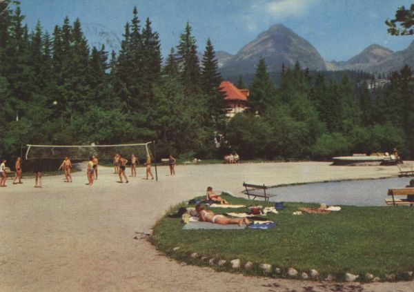 VYSOKÉ TATRY - ŠTRBSKÉ PLESO. Rekreačné stredisko na južnom brehu plesa, v pozadí Solisko.