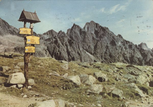 Widok z Doliny Staroleśnej na Pośrednią Grań i Żółty Szczyt. Na pierwszym planie szlak i kierunkowskaz turystyczny.