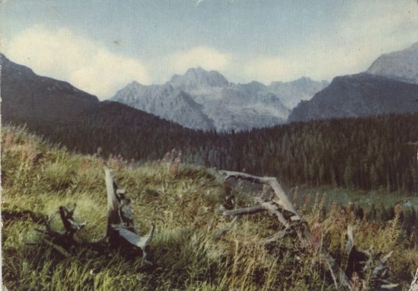 Tatry Wysokie. Od lewej: Wysoka, Smoczy Szczyt, Ganek, Żłobisty Szczyt. Tytuł również w języku: ros., niem., ang.