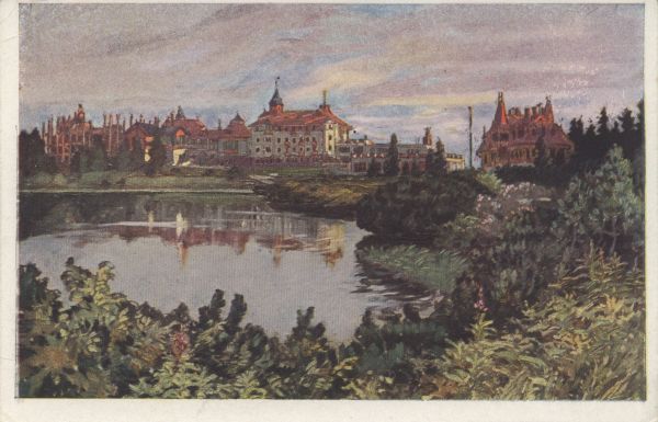 Hotele Krywań i Hviezdoslav nad brzegiem Szczyrbskiego Jeziora. Pocztówka wg obrazu E. Kosy.