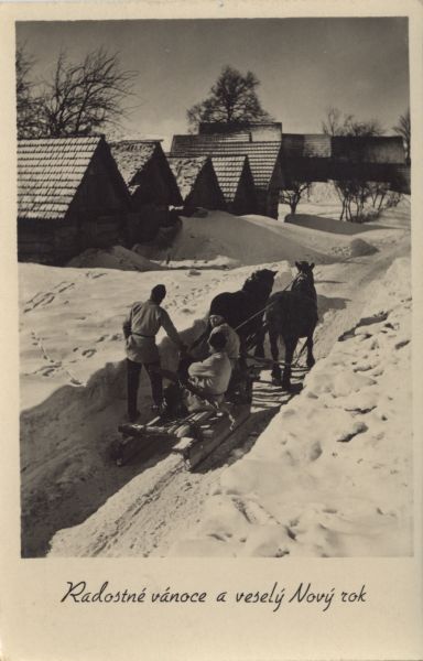 Wieś podtatrzańska zimą. 3 górali na saniach zaprzęgniętych w 2 konie. W tle zabudowania wiejskie. Pod zdjęciem życzenia: Radostné vánoce a veselý Nový rok.