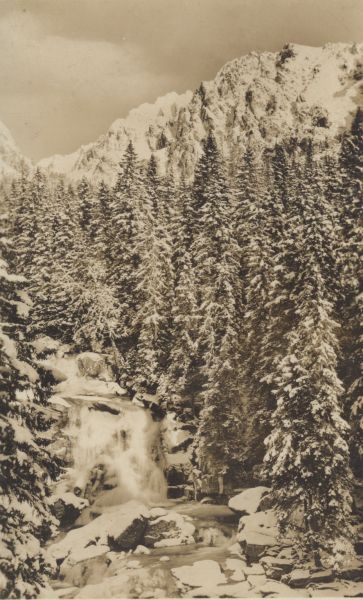 Wodospady Zimnej Wody w zimowej scenerii. W tle grań Łomnicy.