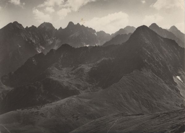 Tatrzański Park Narodowy [Słowacja]. Widok na grupę Łomnicy z Tatr Bielskich. Z lewej: Kieżmarski Szczyt i Łomnica, Baranie Rogi. Z przodu: Jagnięcy Szczyt, z lewej: Kozi Szczyt i Lodowy Szczyt.