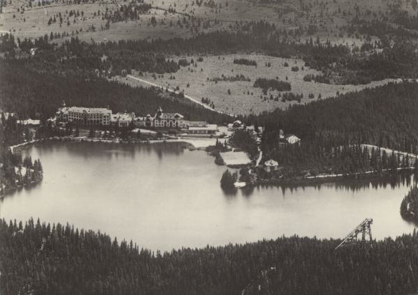 Widok na Szczyrbskie Jezioro i zabudowania sanatoryjno hotelowe. Po prawej stronie w dole pocztówki skocznia narciarska.